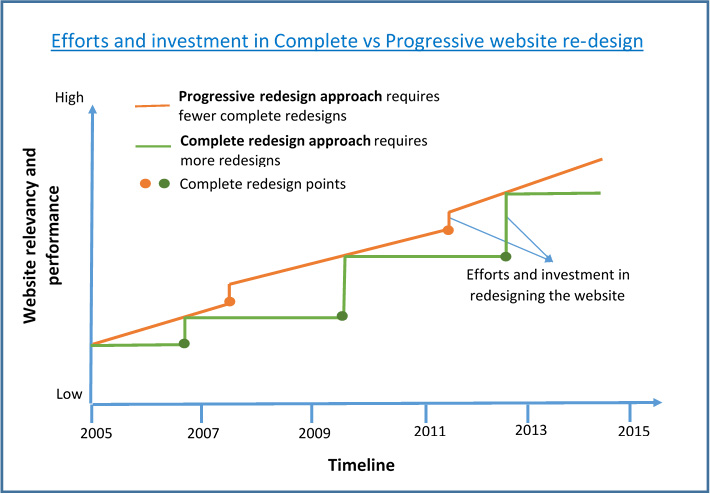 The graph below shows the efforts and investments required in complete vs progressive redesign. A progressive approach keeps your website current on a daily basis is more cost effective over a period of 10 years.